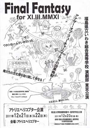 - 福島県立いわき総合高校総合学科第8期生卒業公演「チャンポルギーニとハワイ旅行」(作・演出:前田司郎)+ 同校演劇部東京公演「Final Fantasy for XI.III.MMXI」